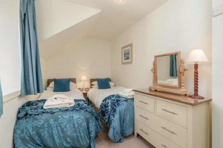 The inviting double bedroom offers a restful retreat, while the twin bedroom provides additional space for guests. The bathroom features a bath, shower cubicle, WC, and basin, ensuring a convenient and comfortable stay.