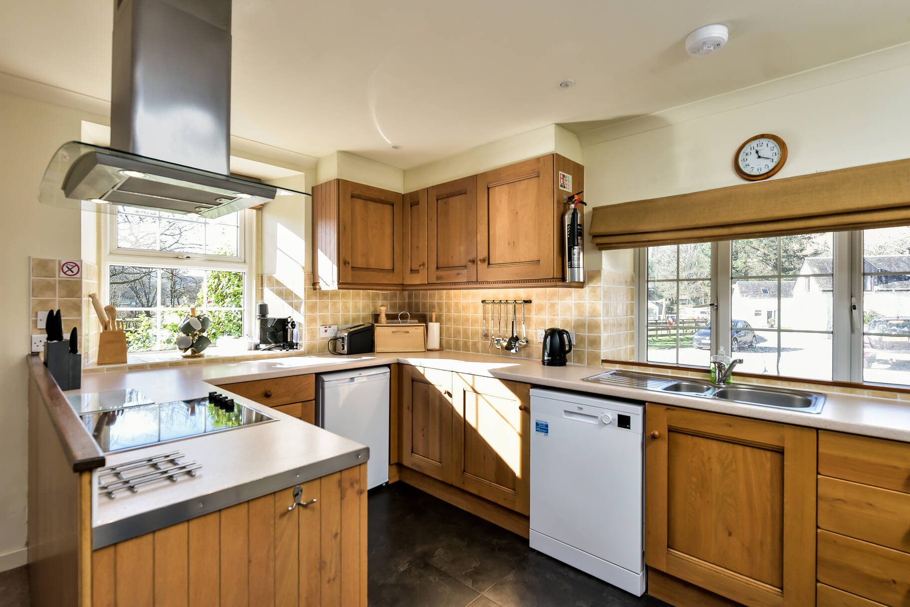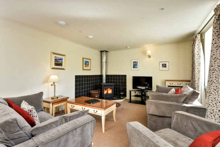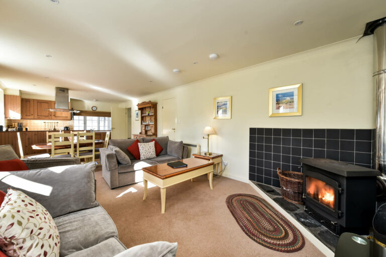 The apartment features a bright and airy sitting room, complete with a cosy wood-burning stove, comfortable seating, and large windows framing picturesque village views. The open-plan kitchen and dining area is well-equipped with an oven, hob, fridge with icebox, microwave, and dishwasher, making it ideal for preparing meals and gathering together. Off the main hallway, you’ll find a generous twin bedroom with views towards Quarry Cottage, and a spacious double bedroom with an en-suite bathroom, including a walk-in shower. A second bathroom with a bath and over-bath electric shower ensures ample convenience for guests.