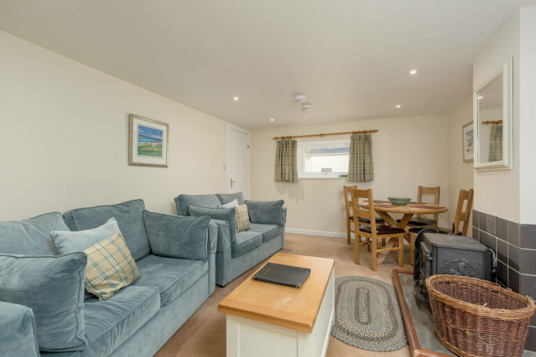 Inside, the open-plan living area exudes warmth and relaxation, featuring a cosy sitting room with a wood-burning stove, a flat-screen TV with Freeview, and a DVD player. The well-equipped kitchen is perfect for preparing meals, and the dining area offers a welcoming space to gather and enjoy them.